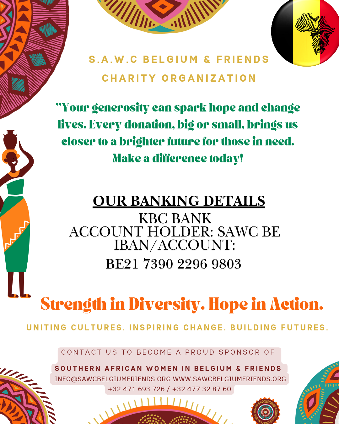 SAWC Belgium & friends is a charity registered in Antwerp, Belgium and with branches in various municipalities through our members (eg Aalst, Bekkevoort, Lede, Tervuren). We have roots to multiple African countries based on our origin by birth (eg Botswana, eSwatini, South Africa, Uganda, Zimbabwe).